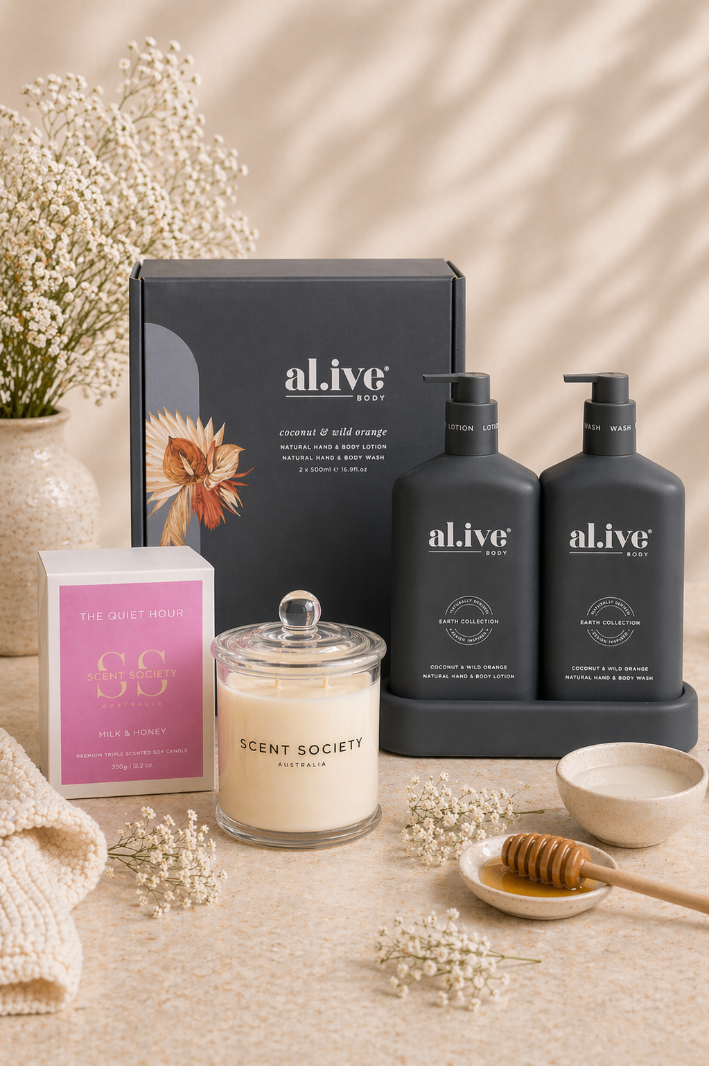 The Quiet Hour (Milk & Honey) + al.ive Bathroom duo (Coconut & Wild Orange) gift set