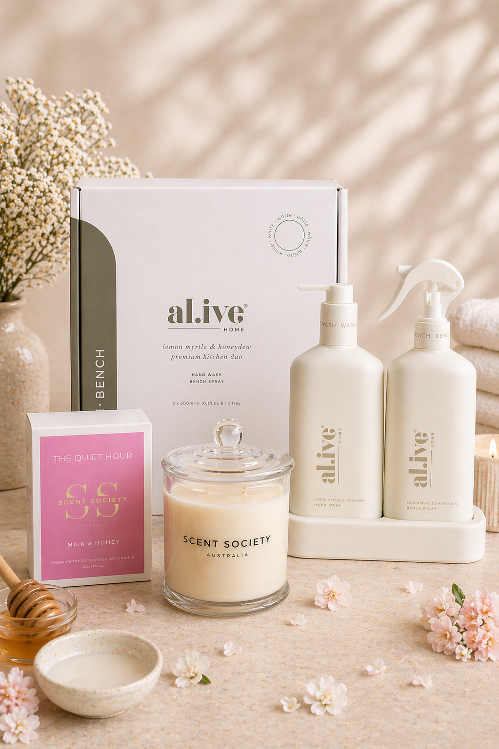 The Quiet Hour (Milk & Honey) + al.ive Kitchen duo (Lemon Myrtle & Honeydew) gift set